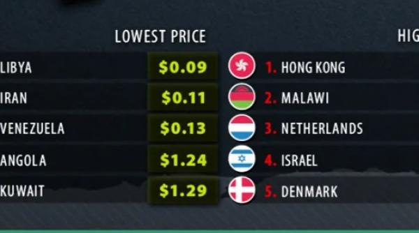 Cea mai scumpă benzină se găsește în regiunile cu venituri mari, dependente de importuri. Hong Kong conduce la nivel global cu 15,65 USD pe galon, urmat de țări europene precum Olanda și Danemarca. De asemenea, în vârful piramidei țărilor cu cele mai mari prețuri mai regăsim Israelul și Malawi.