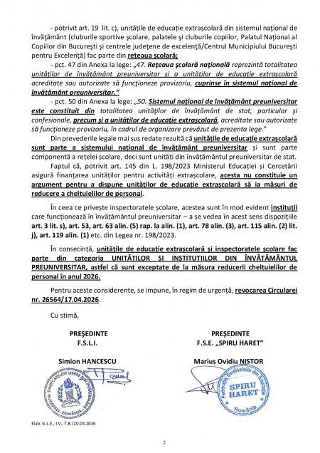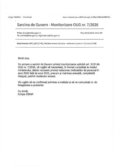 Sindicatele au cerut interpretarea juridică a textului OUG nr 7/2026, iar avocații au ajuns la următoarea concluzie: "Documentul clarifică un aspect esențial pentru sistemul educațional: unitățile și instituțiile din învățământul de stat sunt exceptate de la această reducere, iar în această categorie intră nu doar școlile, liceele și grădinițele, ci și inspectoratele școlare, casele corpului didactic, CJRAE și celelalte structuri care asigură funcționarea sistemului. Principalele concluzii ale opiniei juridice sunt următoarele: