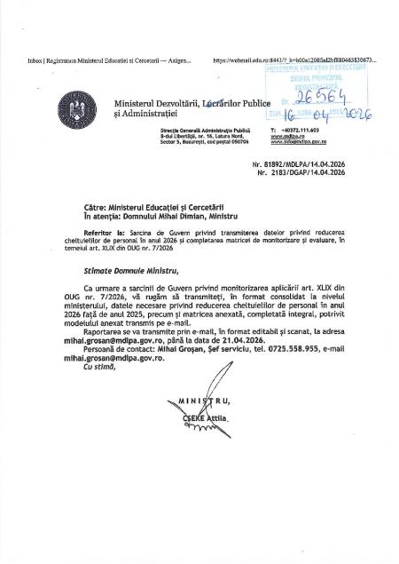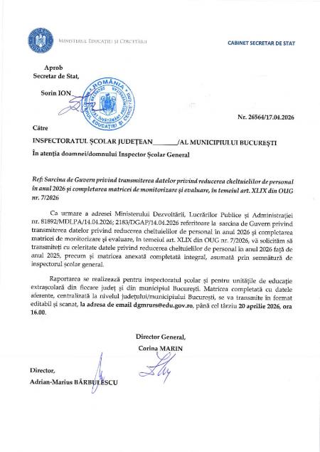 Inspectoratele școlare județene și celelalte structuri conexe beneficiază de aceeași excepție legală de la reducerea cheltuielilor de personal. Orice interpretare restrictivă, prin care s-ar impune reduceri de personal sau diminuări salariale în aceste instituții, contravine textului legal și scopului ordonanței" este opinia juridică elaborată de Finta, Pispeczki, Ungureanu & Asociații privind interpretarea art. XLIX alin. (1) din OUG nr. 7/2026, referitoare la măsura reducerii cu 10% a cheltuielilor de personal în anul 2026, transmisă de Biroul Operativ al Sindicatului SIPA „MUNTENIA”.
