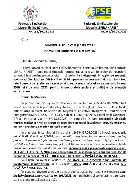 Sindicatele au cerut explicații de la Ministerul Educației, dar comunicarea a fost blocată. Nu s-a ținut cont nici de ceea ce s-a legiferat, nici de consultațiile cu sindicatele, care ar fi trebuit să se facă, ci s-a dispus tăierea de fonduri, de pe o zi pe alta, ceea ce înseamnă concedierea unui nou val de cadre didactice. Sindicaliștii cred că Attila ar fi trimis din greșeală acel document, dar tăierile se fac.