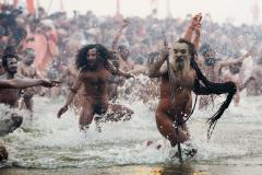 Saduhs, sau bărbaţii sfinţi, aleargă prin apa confluenţei dintre Gange şi Yamuna în timpul festivalului religios Kumbh Mela în Allahabad, India.