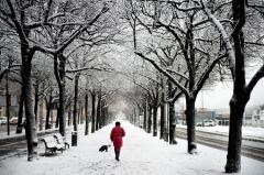 O femeie îşi plimbă căţelul pe o stradă acoperită cu zapadă din centrul oraşului Stockholm., Suedia.