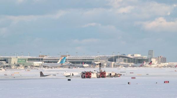 Avionul s-a răsturnat pe pistă în timpul aterizării. Aeroportul din Toronto a fost închis peste două ore din cauza incidentului. În momentul aterizării, în zonă era vânt puternic.