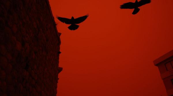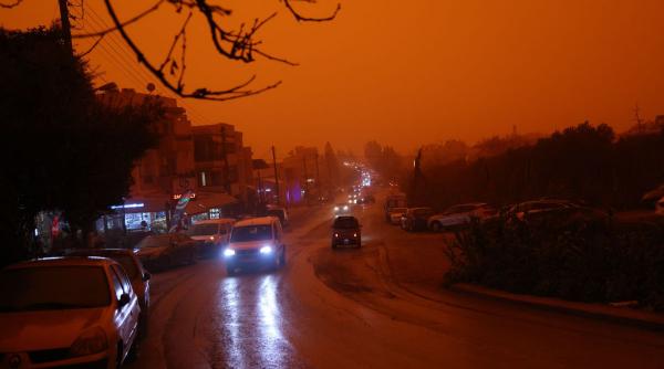 În paralel cu furtunile, insula Creta se confruntă cu un fenomen spectaculos, dar periculos: un nor dens de praf saharian a acoperit cerul, transformându-l într-o nuanță roșiatică-portocalie.