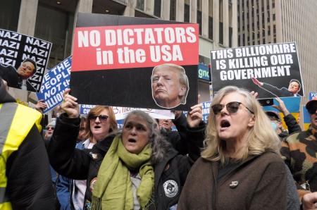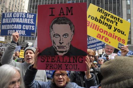 Demonstranții au fluturat pancarte și au strigat împotriva președintelui Donald Trump și a consilierului său important, Elon Musk.