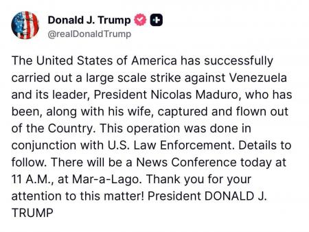 „Statele Unite ale Americii au efectuat cu succes un atac la scară largă împotriva Venezuelei și a liderului său, președintele Nicolas Maduro, care a fost capturat împreună cu soția sa și transportat cu avionul în afara țării”, a scris el pe Truth Social.