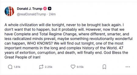„O întreagă civilizație va muri în seara asta, și nu va mai fi readusă niciodată la viață. Nu vreau să se întâmple asta, dar probabil că se va întâmpla. Totuși, acum că avem o Schimbare Completă și Totală a Regimului, unde predomină minți diferite, mai inteligente și mai puțin radicalizate, poate că se poate întâmpla ceva revoluționar minunat, CINE ȘTIE? Vom afla în seara asta, unul dintre cele mai importante momente din lunga și complexa istorie a Lumii. 47 de ani de extorcare, corupție și moarte se vor încheia în sfârșit. Dumnezeu să binecuvânteze Marele Popor al Iranului!”