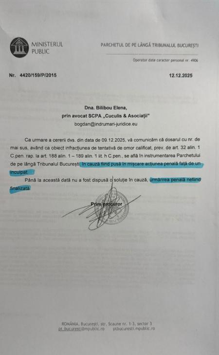 „Ca urmare a cererii dvs. din data de 09.12.2025, vă comunicăm că dosarul cu nr. de mai sus, având ca obiect infracțiunea de tentativă de omor calificat, prev. de art. 32 alin. 1 C. pen. rap. la art. 188 alin. 1 – 189 alin. 1 lit. h C. pen., se află în instrumentarea Parchetului de pe lângă Tribunalul București, în cauză fiind pusă în mișcare acțiunea penală față de un inculpat.