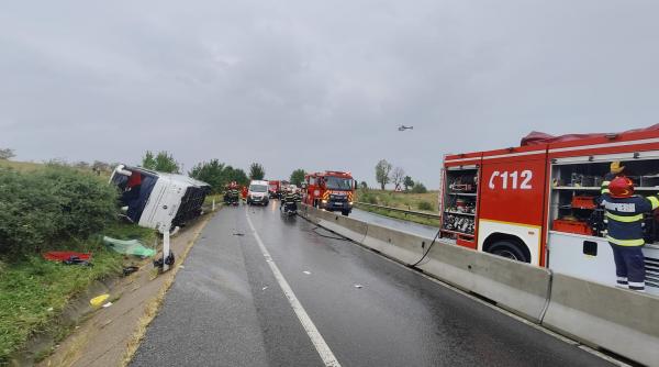 Din primele verificări ale Poliției a reieșit că un bărbat de 44 de ani, aflat la volanul unui autocar în care se aflau 20 de pasageri, pe fondul neadaptării vitezei la condițiile de drum într-o curbă la stânga, ar fi pierdut controlul direcției de deplasare, vehiculul răsturnându-se în afara părții carosabile.