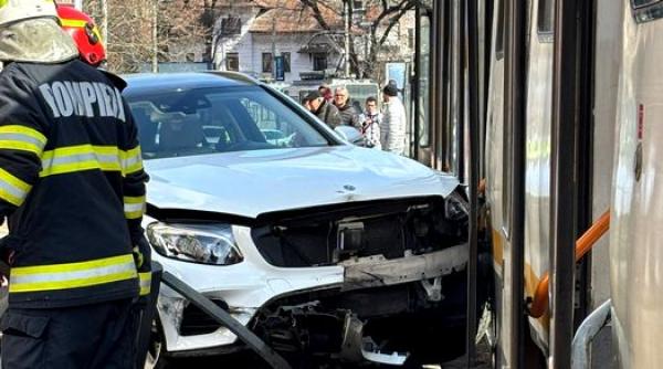 Autoturismul a lovit și un tramvai care era oprit în stație în momentul impactului.