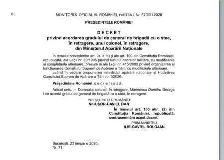 Prin decret al Președintelui României, colonelul (r) dr. George Marinescu a fost avansat la gradul de general de brigadă cu o stea, în retragere. Distincția onorează o carieră militară și medicală marcată de profesionalism, loialitate și devotament față de valorile Armatei României.