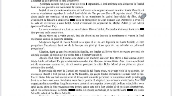 L.D. declară că exploatarea s-a desfășurat inclusiv prin dăruirea unor fete către J.C.V.D., la evenimente desfășurate la Cannes, în contexte organizate de persoane precum B.M., în cadrul unor proiecte de tip „fashion”, unele dintre ele fiind în legătură cu nume precum Fashion TV sau Kasta Morreli.
