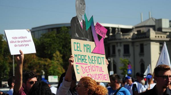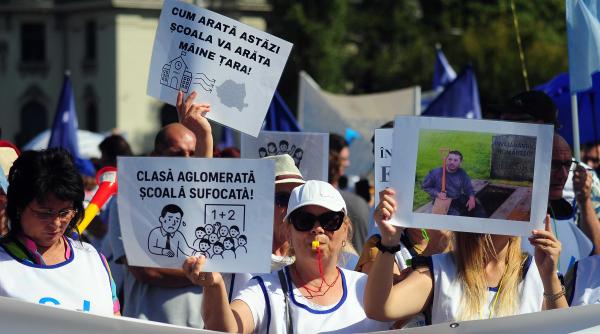 Știre inițială: Profesorii s-au strâns în fața sediului Guvernului. Mii de sindicaliști din învățământ participă luni, de la ora 11.00, la protestul din Capitală, nemulțumiți de măsurile fiscal-bugetare luate de Guvern în acest domeniu.