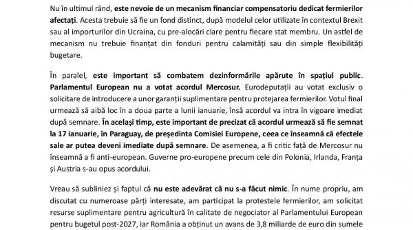 Vreau să subliniez și faptul că nu este adevărat că nu s-a făcut nimic. În nume propriu, am discutat cu numeroase părți interesate, am participat la protestele fermierilor, am solicitat resurse suplimentare pentru agricultură în calitate de negociator al Parlamentului European pentru bugetul post-2027, iar România a obținut un avans de 3,8 miliarde de euro din sumele alocate după 2031. De asemenea, am organizat un eveniment amplu în Parlamentul European, cu participarea eurodeputaților, fermierilor și responsabililor guvernamentali din Europa Centrală și de Est.