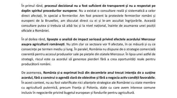 În primul rând, procesul decizional nu a fost suficient de transparent și nu a respectat pe deplin spiritul procedurilor europene. Nu a existat o consultare reală și sistematică a celor direct afectați, în special a fermierilor. Am fost prezent la protestele fermierilor români și europeni de la Bruxelles, am discutat direct cu ei și le-am ascultat îngrijorările. Această consultare putea și trebuia să aibă loc și la nivel național, înainte de asumarea unei poziții oficiale a României.