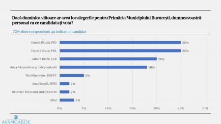 Potrivit sondajului Avangarde, reprezentativ la nivelul populației adulte din Capitală și realizat prin metoda CATI pe un eșantion de 1.070 de persoane, Băluță și Ciucu conduc topul preferințelor pentru funcția de primar general.