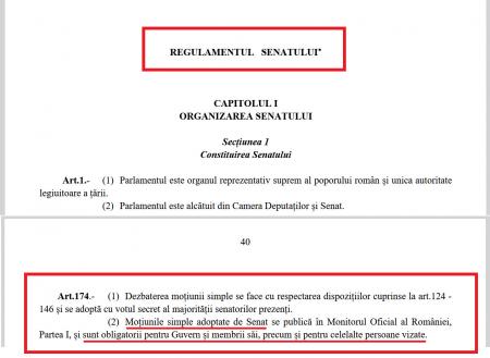 Potrivit articolului 174, alineatul 2, din Statutul Senatului României, „moțiunile simple adoptate de Senat se publică în Monitorul Oficial al României, Partea I, și sunt obligatorii pentru Guvern și membrii săi, precum și pentru celelalte persoane vizate” (VEZI FACSIMIL). Ei, bine, săptămâna aceasta, Senatul României a adoptat moțiunea simplă a Opoziției împotriva ministrului USR al Mediului, Diana Buzoianu. Hotărârea prin care se constată adoptarea moțiunii, inclusiv moțiunea în sine au fost publicate, la data de 15 decembrie 2025, în Monitorul Oficial al României nr. 1162/2025. Astfel încât a devenit obligatorie pentru premierul Ilie Bolojan, pentru membrii Guvernului condus de Ilie Bolojan și pentru celelalte persoane vizate de această moțiune.