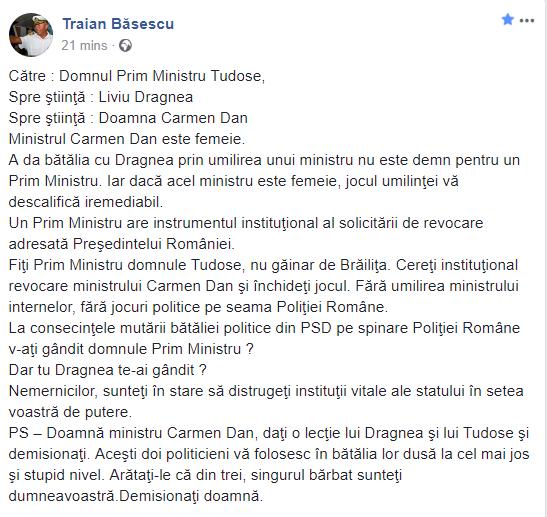 PS – Doamnă ministru Carmen Dan, daţi o lecţie lui Dragnea şi lui Tudose şi demisionaţi. Aceşti doi politicieni vă folosesc în bătălia lor dusă la cel mai jos şi stupid nivel. Arătaţi-le că din trei, singurul bărbat sunteţi dumneavoastră.Demisionaţi doamnă", a scris Traian Băsescu pe pagina sa de Facebook.