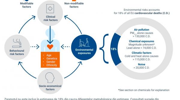 Se estimează că factorii-cheie de mediu (poluarea aerului, temperaturile extreme și substanțele chimice) au fost responsabili pentru cel puțin 18% din cele peste 1,7 milioane de persoane care au murit din cauza bolilor cardiovasculare în Europa, în 2022. Ceea ce înseamnă peste 300.000 de vieți pierdute, într-un singur an. Mai mult, această povară este distribuită inegal în UE, se subliniază în raport, iar cifrele sunt subestimate, deoarece „nu includ expunerea la zgomotul ambiental și la multe substanțe chimice cardiotoxice”.