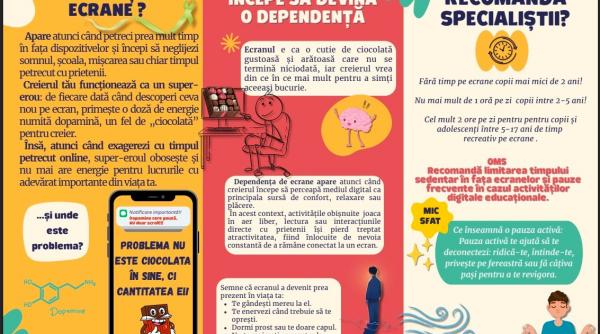 „Ecranul e ca o cutie de ciocolată gustoasă și arătoasă care nu se termină niciodată, iar creierul vrea din ce în ce mai mult pentru a simți aceeași bucurie. Semne că ecranul a devenit prea prezent în viața ta: te gândești mereu la el, te enervezi când trebuie să te oprești, dormi prost sau te doare capul, nu te mai poți concentra la școală, începi să ascunzi cât timp petreci online”, explică specialiștii care sunt „simptomele” dependenței digitale, pe înțelesul copiilor și adolescenților.
