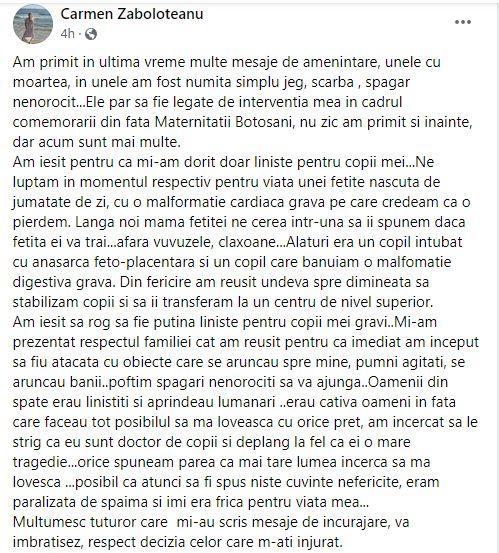 "Am primit în ultima vreme multe mesaje de amenințare, unele cu moartea, în unele am fost numită simplu jeg, scârbă, șpăgar nenorocit...Ele par să fie legate de intervenția mea în cadrul comemorării din fața Maternității Botoșani, nu zic am primit și înainte, dar acum sunt mai multe.