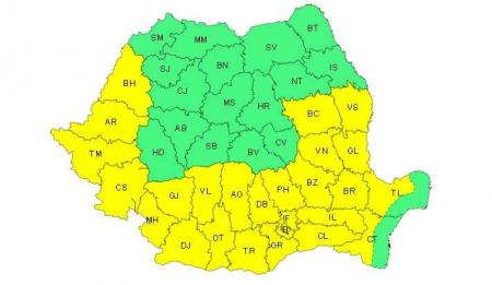 Judeţele avertizate sunt: Argeş, Arad, Bacău, Bihor, Brăila, Buzău, Călăraşi, Caraş-Severin, Constanţa, Dâmboviţa, Dolj, Gorj, Galaţi, Giurgiu, Ilfov, Ialomiţa, Mehedinţi, Olt, Prahova, Tulcea, Timiş, Teleorman, Vâlcea, Vrancea şi Vaslui.