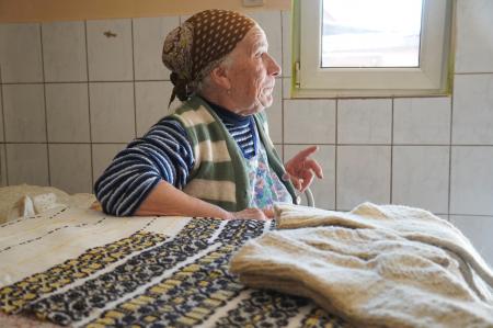 Pe ea se odihnesc acum câteva perechi de șosete din lână. „Le-am lucrat astă iarnă, la piață, când am fost cu brânză. Mă întrebau cucoanele dacă nu-mi îngheață degetele când lucrez. Păi ce, lor le îngheață când stau cu telefonul în mână și degetele pe ecran?”, își amintește femeia.