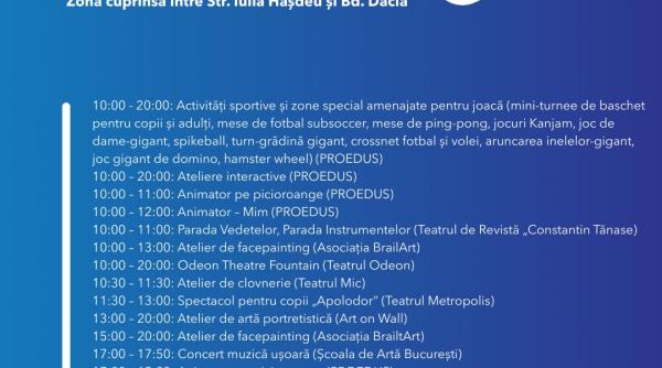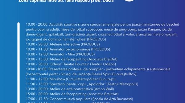 10:00 - 20:00: Activități sportive și zone special amenajate pentru joacă (miniturnee de baschet pentru copii și adulți, mese de fotbal subsoccer, mese de ping-pong, jocuri Kanjam, joc de dame-gigant, spikeball, turn-grădină gigant, crossnet fotbal și volei, aruncarea inelelor-gigant, joc gigant de domino, hamster wheel (PROEDUS)