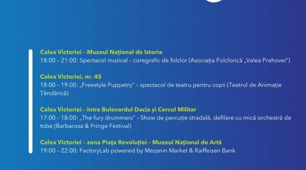 Bucureștenii sunt așteptați să descopere un weekend cu spectacole pentru toate vârstele: de la show-ul exploziv de percuție The Fury Drummers (Barbarosa & Fringe Festival), la spectacolul muzical-coregrafic de folclor, prezentat de Asociația Folclorică „Valea Prahovei”, în zona Muzeului Național de Istorie. Cei mici se vor bucura de spectacolele interactive ale Teatrului Țăndărică, programate pe Calea Victoriei nr. 45.