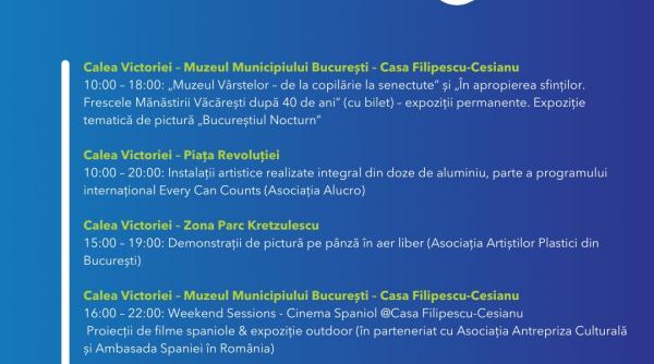 Curtea Casei Filipescu-Cesianu găzduiește, sâmbătă și duminică, proiecții de filme spaniole și o expoziție outdoor în cadrul evenimentului Weekend sessions, realizat în parteneriat cu Ambasada Spaniei și Asociația Antrepriza Culturală. Tot aici, vizitatorii pot descoperi expozițiile permanente ale Muzeului Municipiului București: „Muzeul Vârstelor” și „În apropierea sfinților”, precum și expoziția tematică de pictură „Bucureștiul Nocturn”.